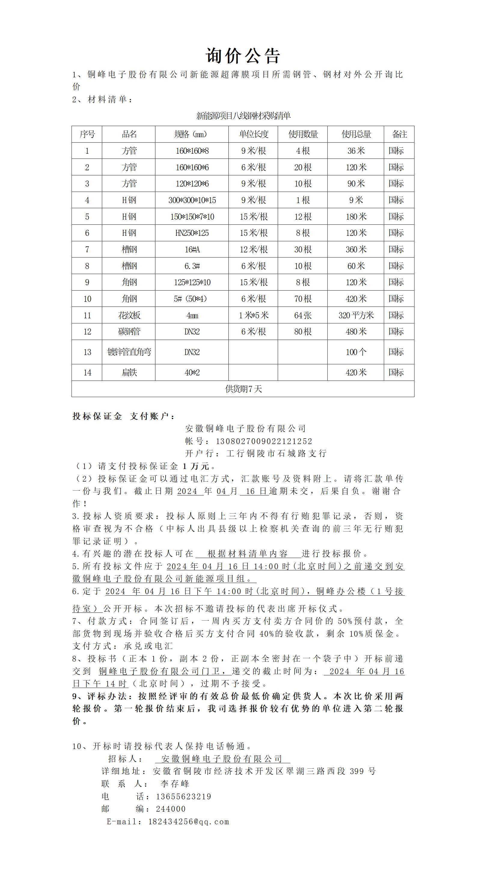 銅峰電子股份有限公司新項(xiàng)目八線(xiàn)鋼材詢(xún)價(jià)公告