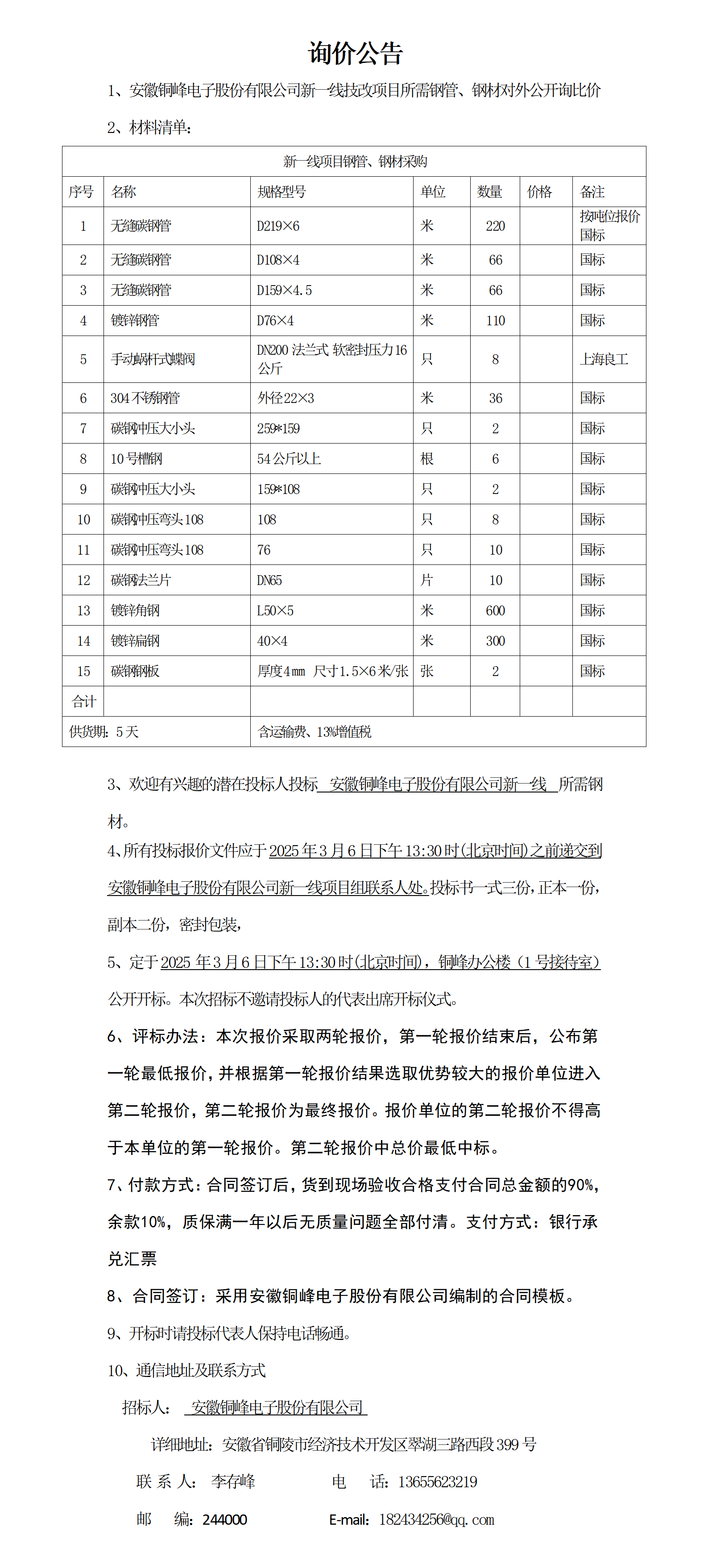 安徽銅峰電子股份有限公司新一線項(xiàng)目鋼材詢價(jià)公告_01
