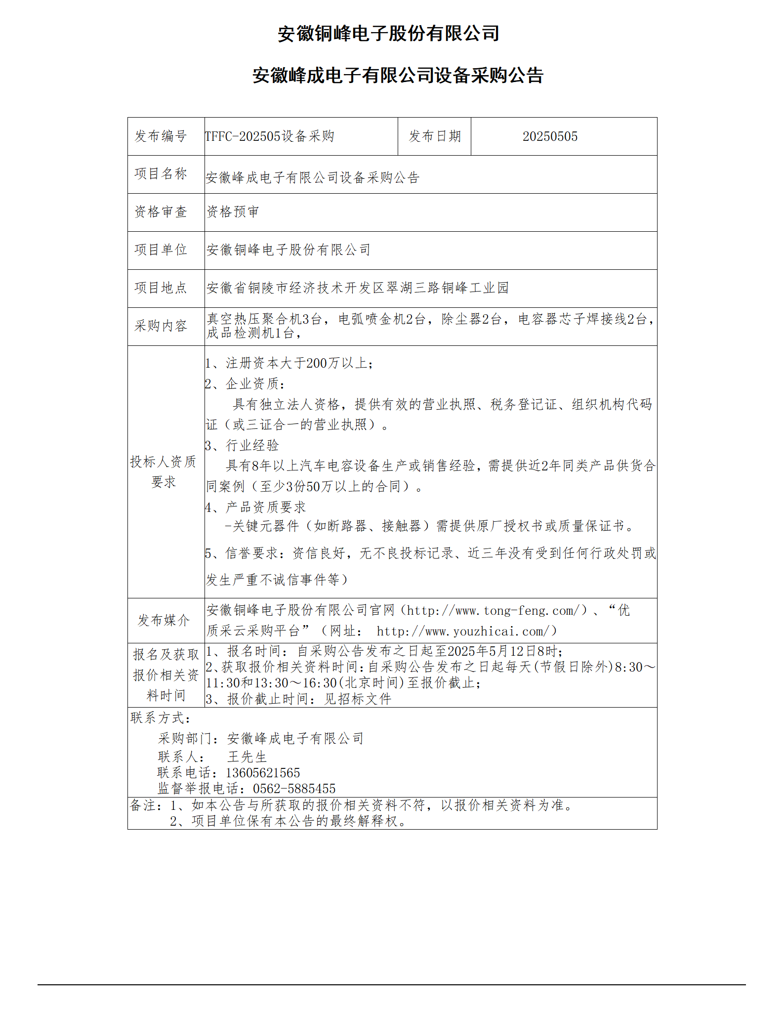 安徽峰成電子有限公司設備采購公告(1)_01