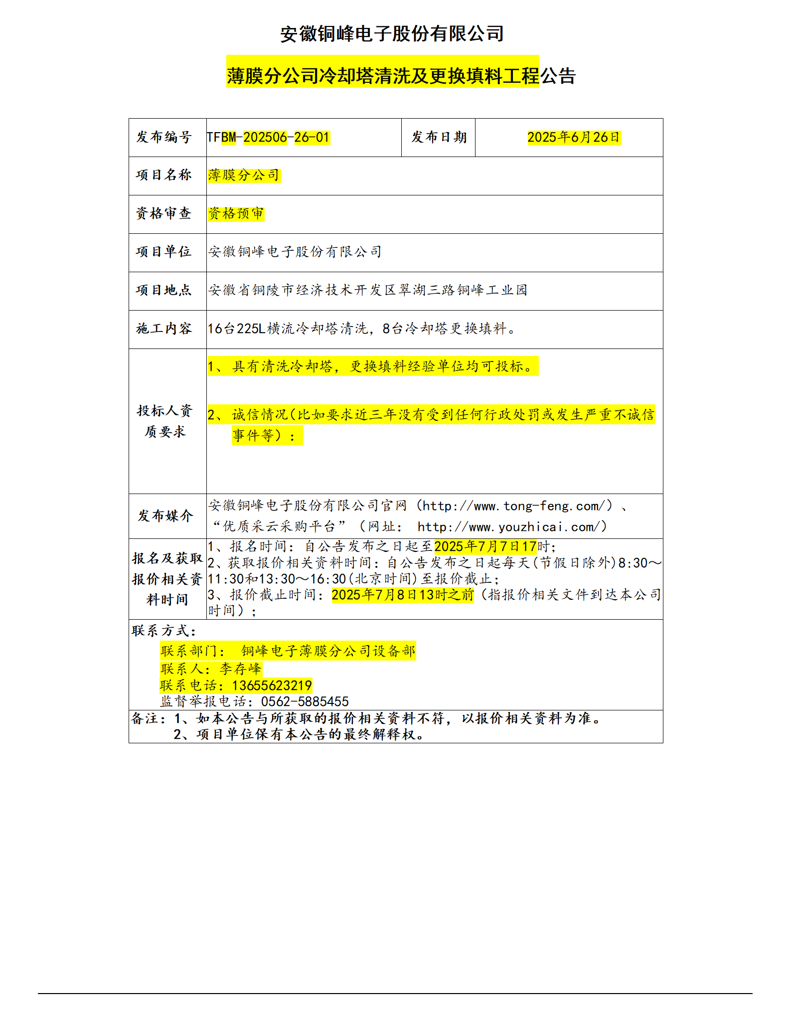 安徽銅峰電子股份有限公司 (冷卻塔清洗公告)_01