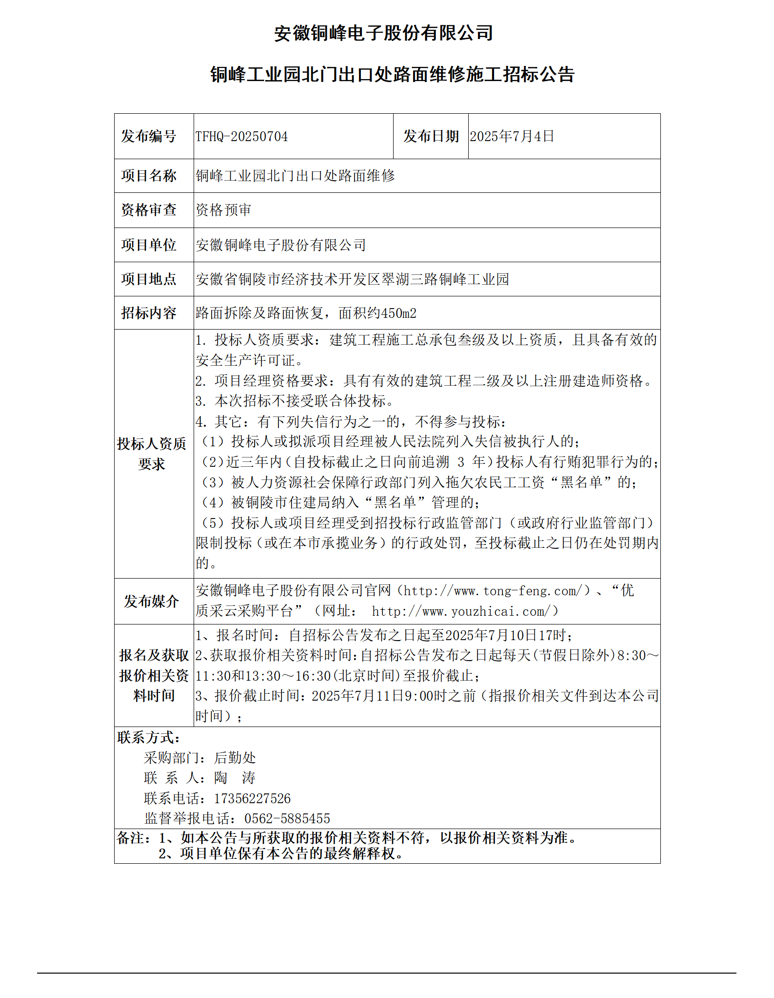 安徽銅峰電子股份有限公司 (銅峰工業(yè)園北門出口處路面維修招標(biāo)公告)_01