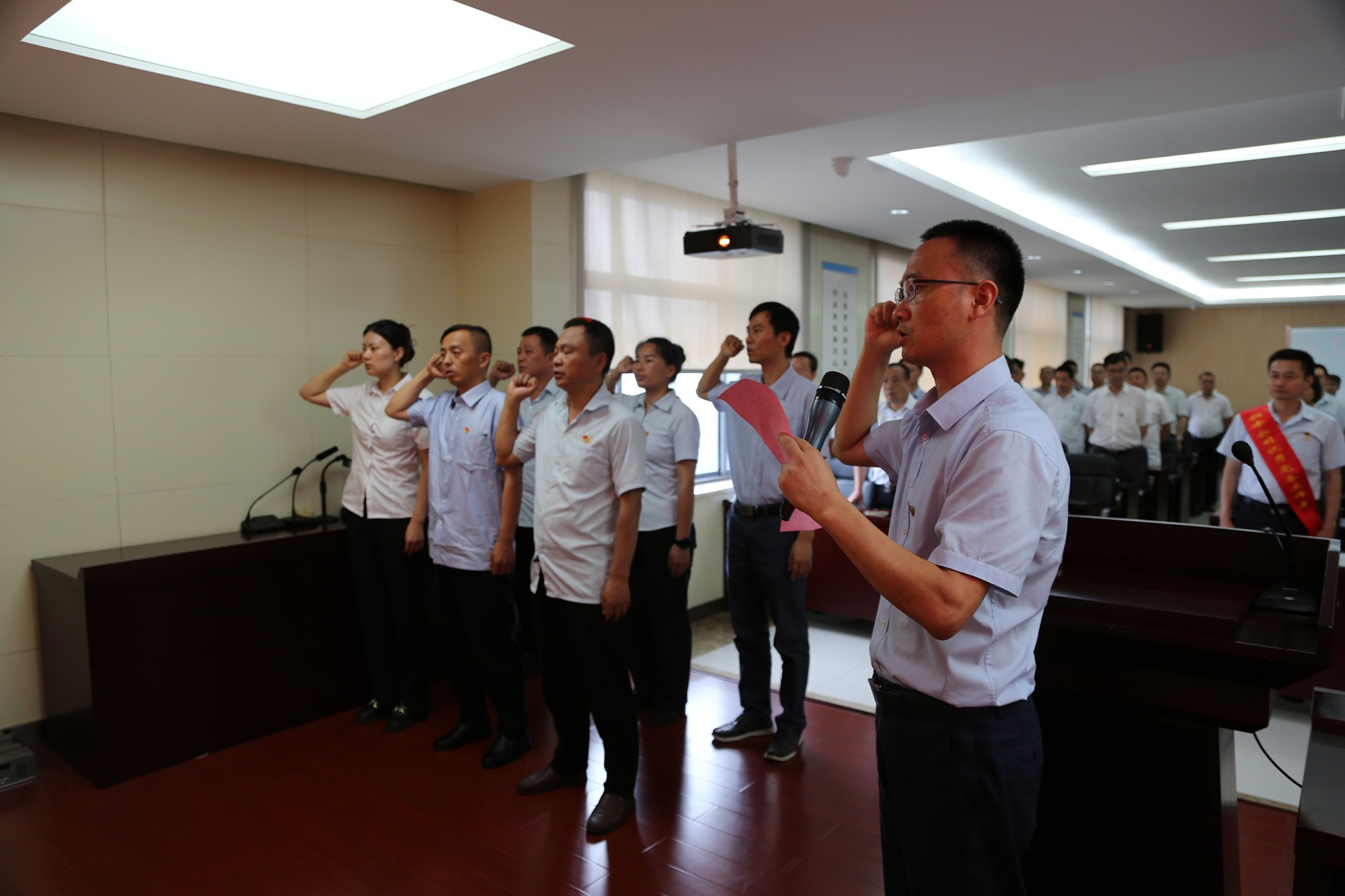 在首先進行的新黨員入黨宣誓儀式上,黨委委員林政宣布新黨員名單,歡迎新黨員加入黨組織并向他們提出希望和要求。隨后,由黨委委員何曉明領誓,新黨員進行入黨宣誓。在“兩優(yōu)一先”表彰環(huán)節(jié),公司黨委領導為受表彰對象頒發(fā)榮譽證書,“兩優(yōu)一先”代表分別作先進事跡報告。