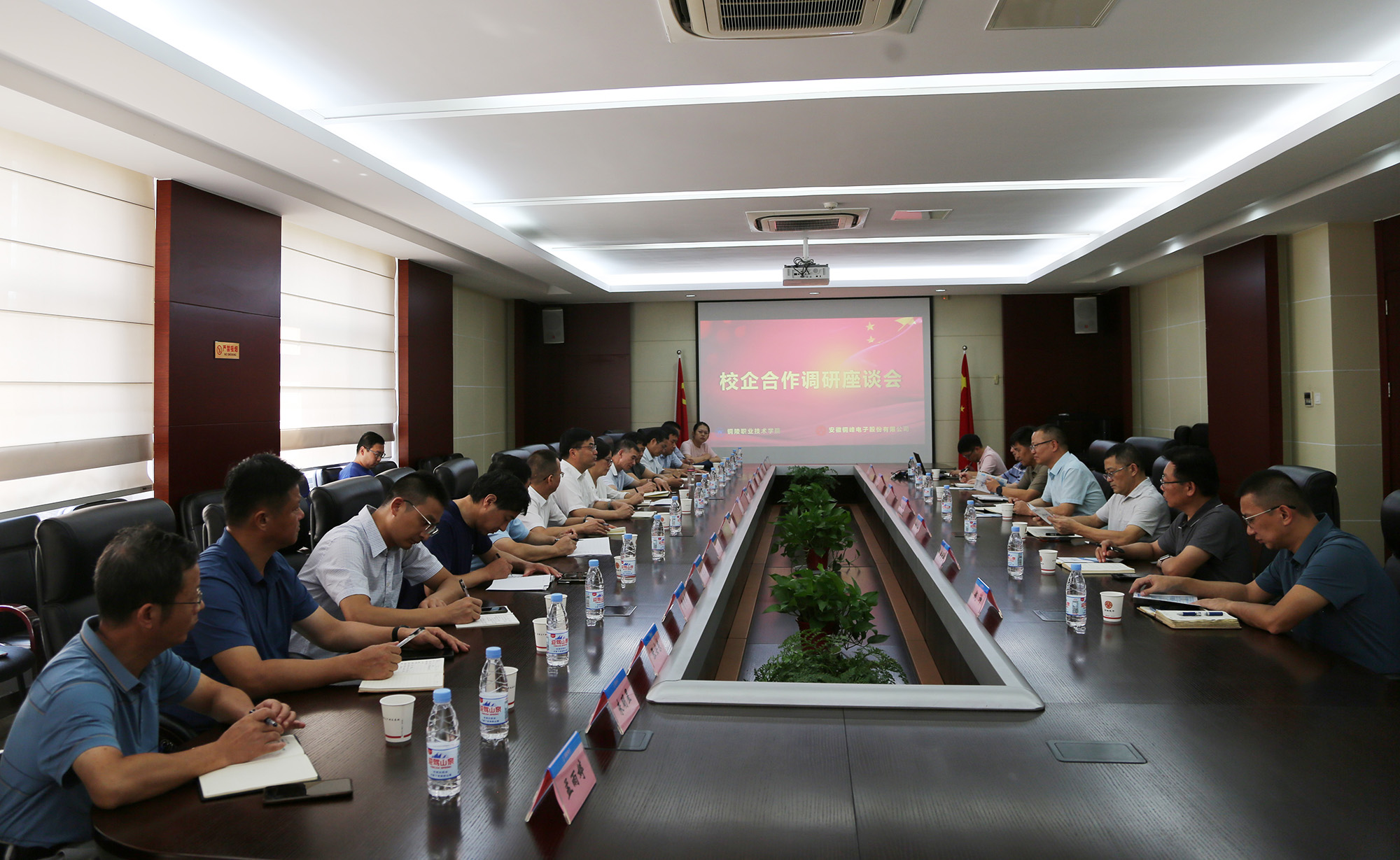 8月24日下午,銅陵職業(yè)技術(shù)學(xué)院黨委書記、市發(fā)改委主任凌勇,黨委副書記、院長凌濤,黨委副書記徐文等學(xué)院領(lǐng)導(dǎo)和相關(guān)職能處室負(fù)責(zé)人來公司開展校企合作調(diào)研座談活動。公司黨委書記、董事長黃明強,常務(wù)副總經(jīng)理、總工程師儲松潮,副總經(jīng)理、財務(wù)總監(jiān)郭傳紅,黨委副書記、紀(jì)委書記、工會主席潘世宇及相關(guān)職能部門負(fù)責(zé)人陪同調(diào)研。