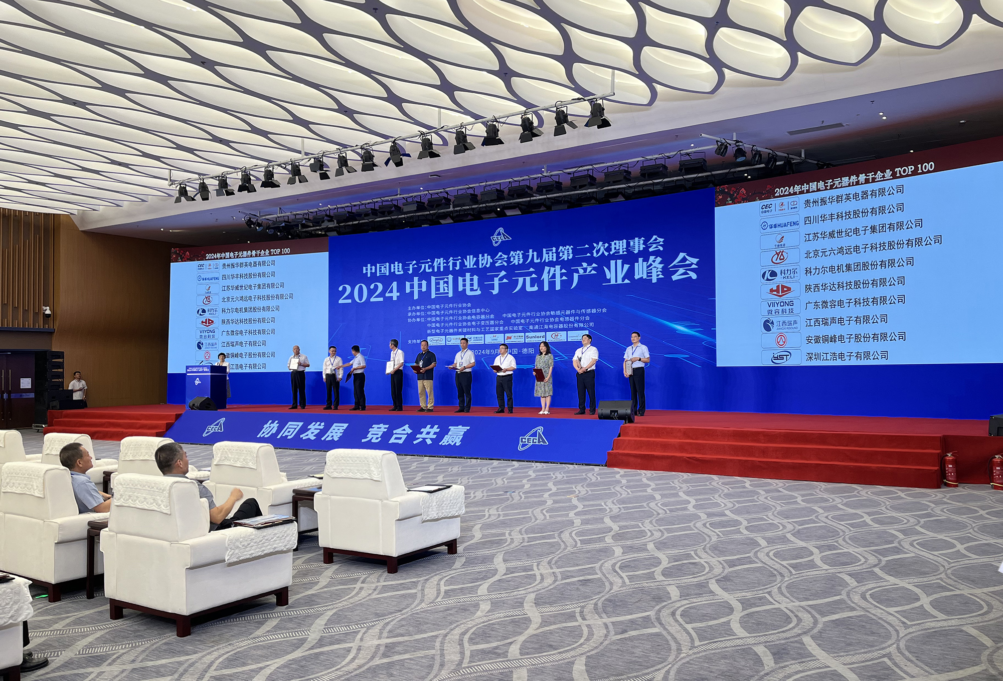 會議過程中,除舉辦主題演講、高端對話、分會平行論壇外,還舉行了2024年中國電子元器件行業(yè)骨干企業(yè)授牌儀式,公司再次獲評“中國電子元器件骨干行業(yè)TOP100 ”榮譽,這是公司連續(xù)三十余屆入選行業(yè)百強。