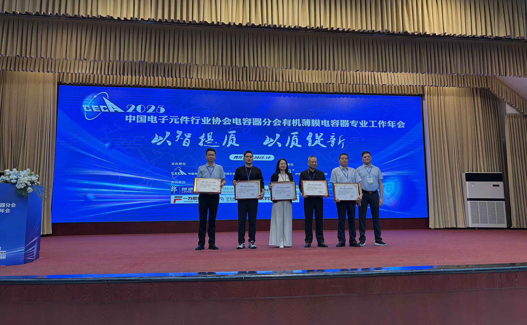 10月14日至17日,中國電子元件行業(yè)協(xié)會電容器分會有機專業(yè)2025年工作年會在四川瀘州成功舉辦。中電元協(xié)常務(wù)理事、電容器分會第九屆副理事長、公司總經(jīng)理鮑俊華代表公司出席并作主題交流報告。薄膜分公司獲評電容器分會2025年度“優(yōu)秀供應(yīng)商”榮譽稱號。